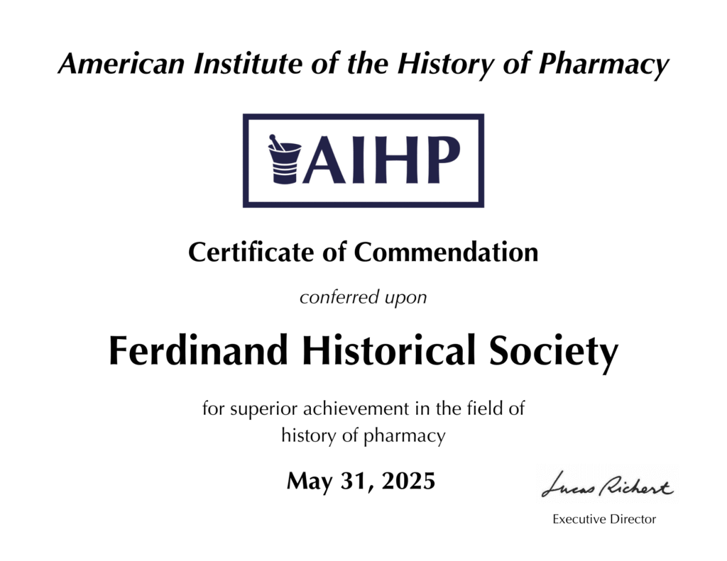 The Certificate of Commendation was conferred and the historical marker unveiled at the former site of the Adler Apothek and Ferdinand Post Office on Saturday, May 31, 2025. John Clark, former AIHP Director, presented the Certificate to the historical society at the ceremony.