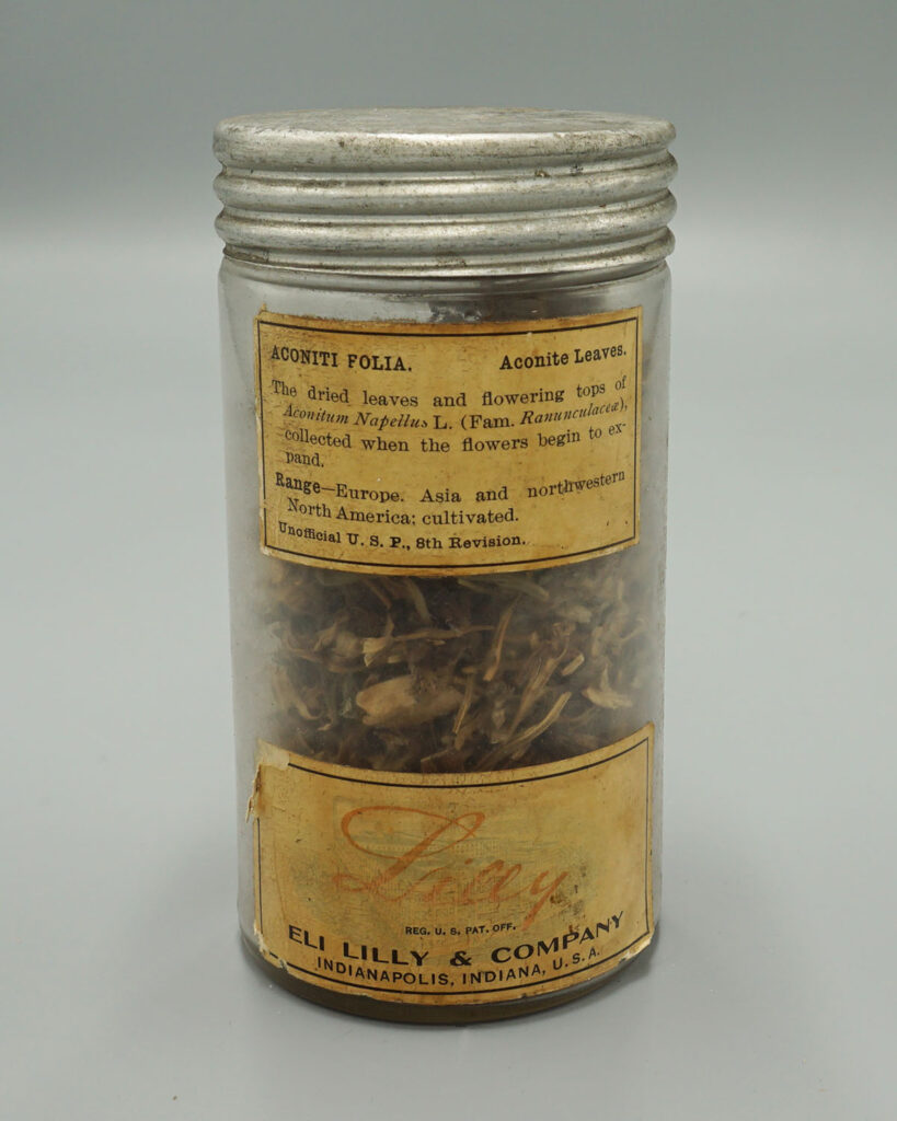 Kristen Huset, AIHP Program Manager, selects a jar of Aconite Leaves from our Eli Lilly Drug Jar Collection. Kristen writes: “I am fascinated by old medicines that are also toxic and poisonous. With all of my options, how do I pick a favorite? Belladonna is a particular favorite, but I went with Aconite because it has some peculiar associations. If the name sounds familiar, you might be a fan of pharmacy history, or simply a fan of murder mysteries where poison is a favorite tool for demise. That’s where I first learned about Aconite.