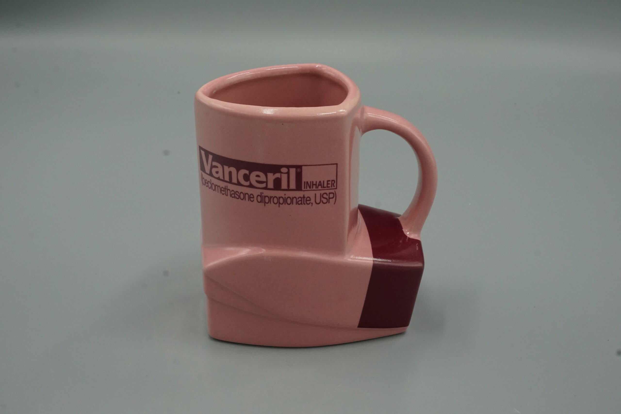 For my selection, I have chosen to highlight a ‘sneak peek’ artifact from the Michael Madalon Collection, which will be available for access in our digital collections later this Spring! Of the nearly 400 promotional items in this collection I’ve been working to digitize, the unique inhaler shape of this Vanceril® ceramic mug certainly caught my eye.
