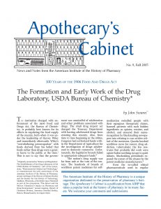 From 2000 to 2006, AIHP published Apothecary’s Cabinet, which featured shorter articles on pharmaco-historical topics for students and other non-specialists. Apothecary’s Cabinet contains introductory and explanatory articles by some of the leading historians of American pharmacy, including David Cowen, William Helfand, and many others.