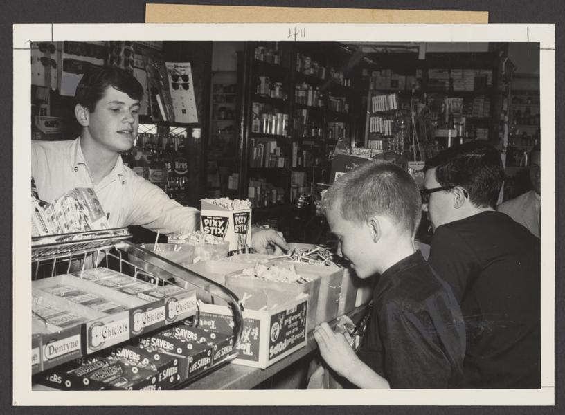 A photo depicting children purchasing candy at a drugstore, from the American Institute of the History of Pharmacy : Drug Topics Photograph Collection at the University of Wisconsin Digital Collections.