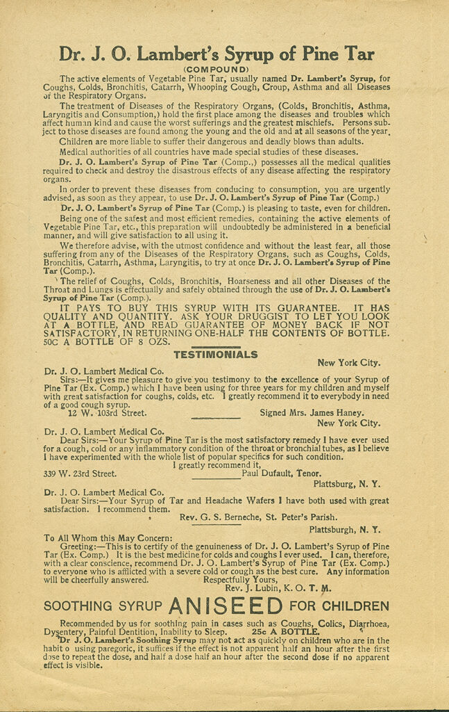 First page of an ad for Dr. J. O. Lambert’s Syrup of Pine Tar, which claims to be “guaranteed under the Pure Food and Drugs Act” from the Edward Kremers Research Library and Archive.