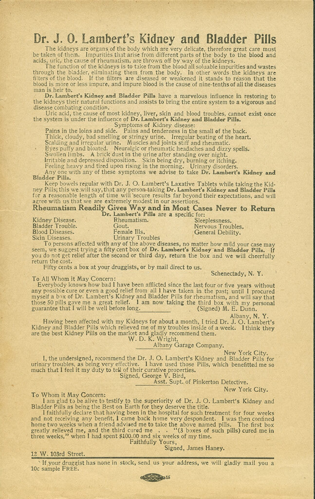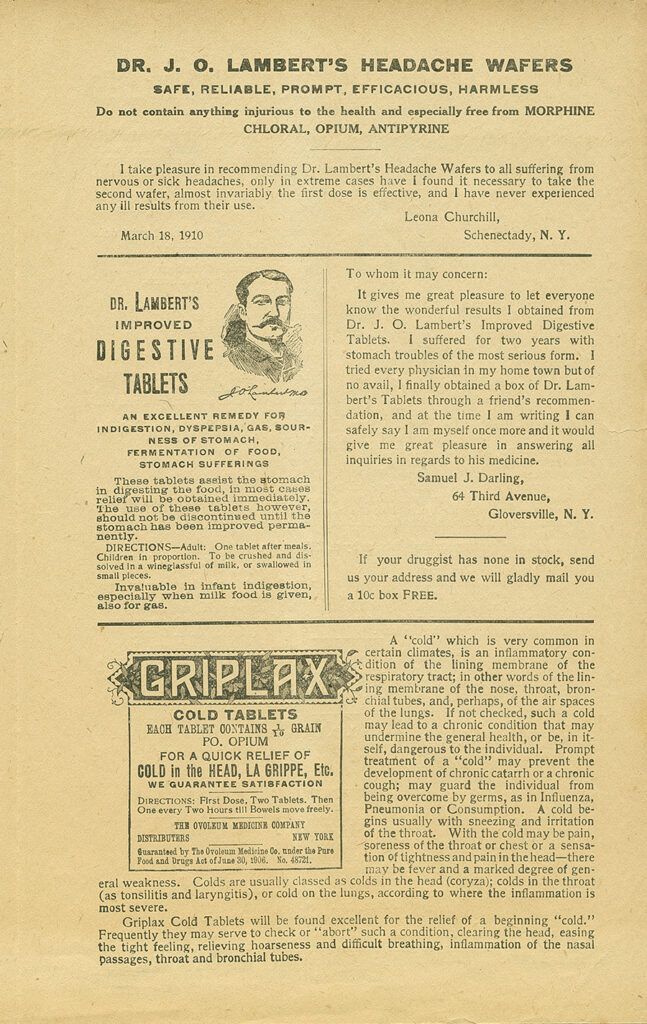 Prior to 1906, the medicine market looked very different than it does today. Prescriptions were not necessary and patients were generally able to self-medicate without consulting a doctor or pharmacist. The actual contents of medicines were not always known to the buyer as the manufacturers were not obligated to make their proprietary formulas public. As a result, the composition of many solutions on the market during this period have been lost to time. However, it was quite common for these medicines to contain opiates, alcohol, and other intoxicants. Drugs of this kind were called “patent medicines” and were often distinguished from drugs compounded and sold by a trained pharmacist. Although they had existed since the 17th century, the patent medicine industry boomed in the late 1800s largely due to the growth of mass media. Patent medicine manufacturers were some of the most aggressive advertisers in newspapers and magazines and often relied on this advertising and name recognition to win over customers. Advertisements were also distributed by mail, and most medicine could be purchased via mail.