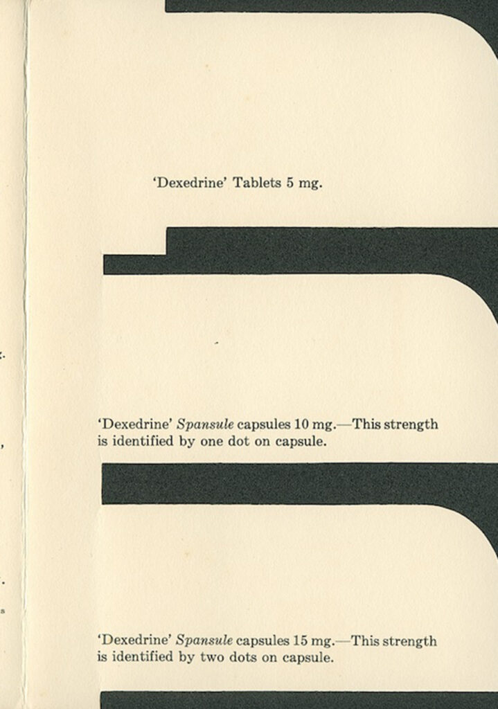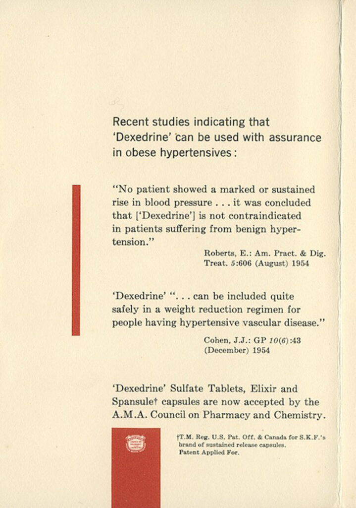 Third page of an ad for dexedrine sulfate, a medicine containing amphetamine, marketed as an appetite suppressant, from the James Harvey Young Drug Advertising Collection. The back side of this page is blank.