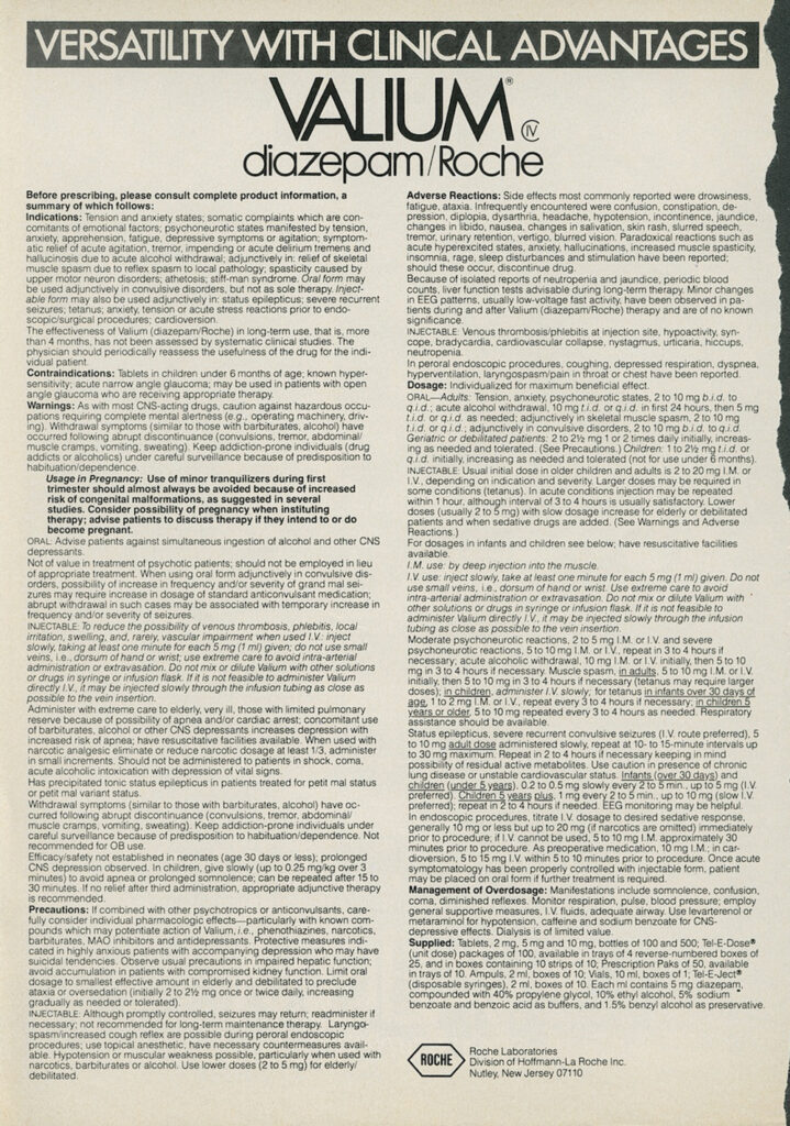 By the 1960s, the FDA had become the main regulatory body presiding over drugs and pharmacy. Congress still played a significant role in drug regulation–the Controlled Substances Act being a significant example–but the regulation of advertisement was well within the FDA’s domain. Consequently, from this point on it is difficult to speak of specific pieces of legislation which contributed to a rapid change in pharmaceutical regulation. Still, guidelines for drug advertising changed significantly in the 1960s and 1970s. For instance, advertisers were now obligated to provide a “brief” summary of potential dangers and side effects of the advertised drug. One ad for valium published in the 1980s demonstrates these changes: the backside contains a full page of text describing instructions for use, potential side effects, proper dosages, and more.