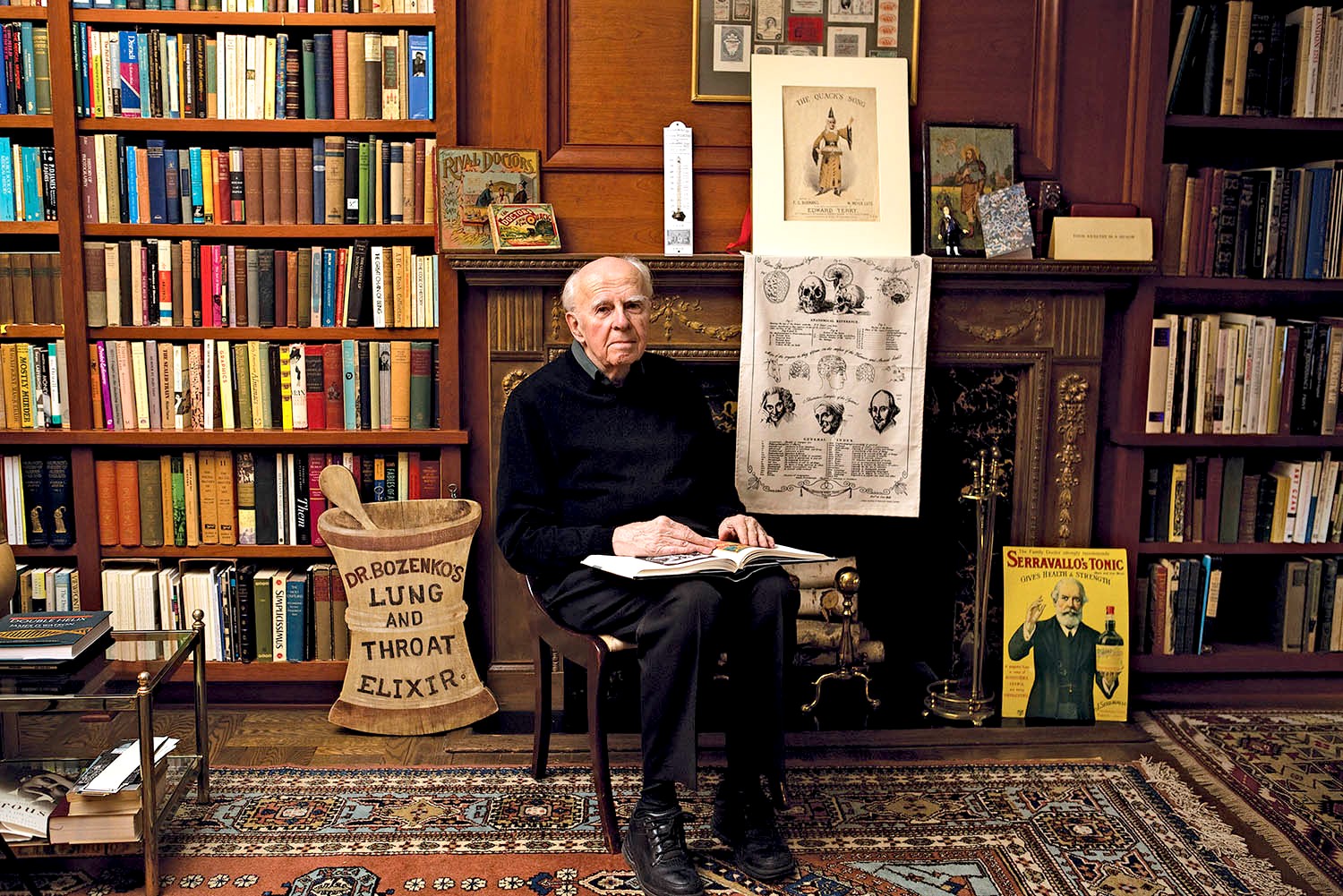 William Helfand poses with items from his heralded collection of medical and pharmaceutical ephemera.
