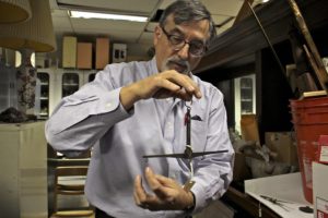 Greg Higby demonstrating the use of a hand scale, that was uncovered at the University of the Sciences, on his visit. Image courtesy of Emma Lee/WHYY