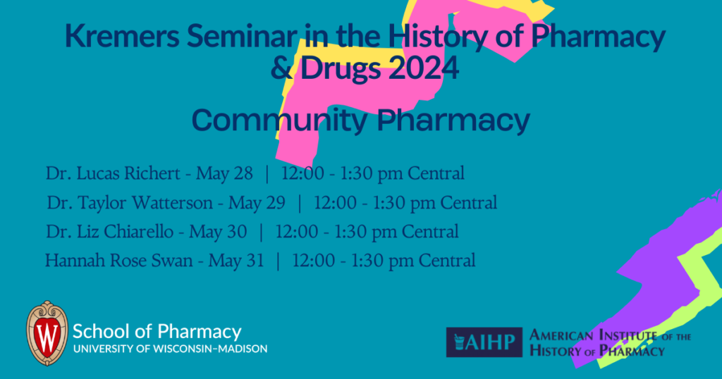 The 2024 Edward Kremers Seminar in the History of Pharmacy and Drugs will focus on community pharmacy from a variety of perspectives and disciplines. In 2022-2023, the pharmacy space was forced to reckon with pharmacist mental health fatigue, strikes over pay and layoffs, pharmacy store closures, and ongoing opioid litigation related to pharmacy chains. To varying extents, all of these issues intersected with and impacted community pharmacy. The 2024 “Kreminar” will aim to explore some of these topics from multiple angles and through a diverse group of speakers.