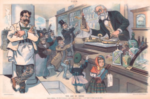 Puck, “The Age of Drugs”: Satirical cartoon showing the inside of an early-twentieth-century drugstore. The pharmacist (right) dispenses labelled medicine bottles to his customers. The bottles on the counter include arsenic, strychnine, opium, and cocaine. On the left, a saloon keeper leans against a column, and says (in the caption): “The kind of drunkard I make is going out of fashion. I can’t begin to compete with this fellow.”