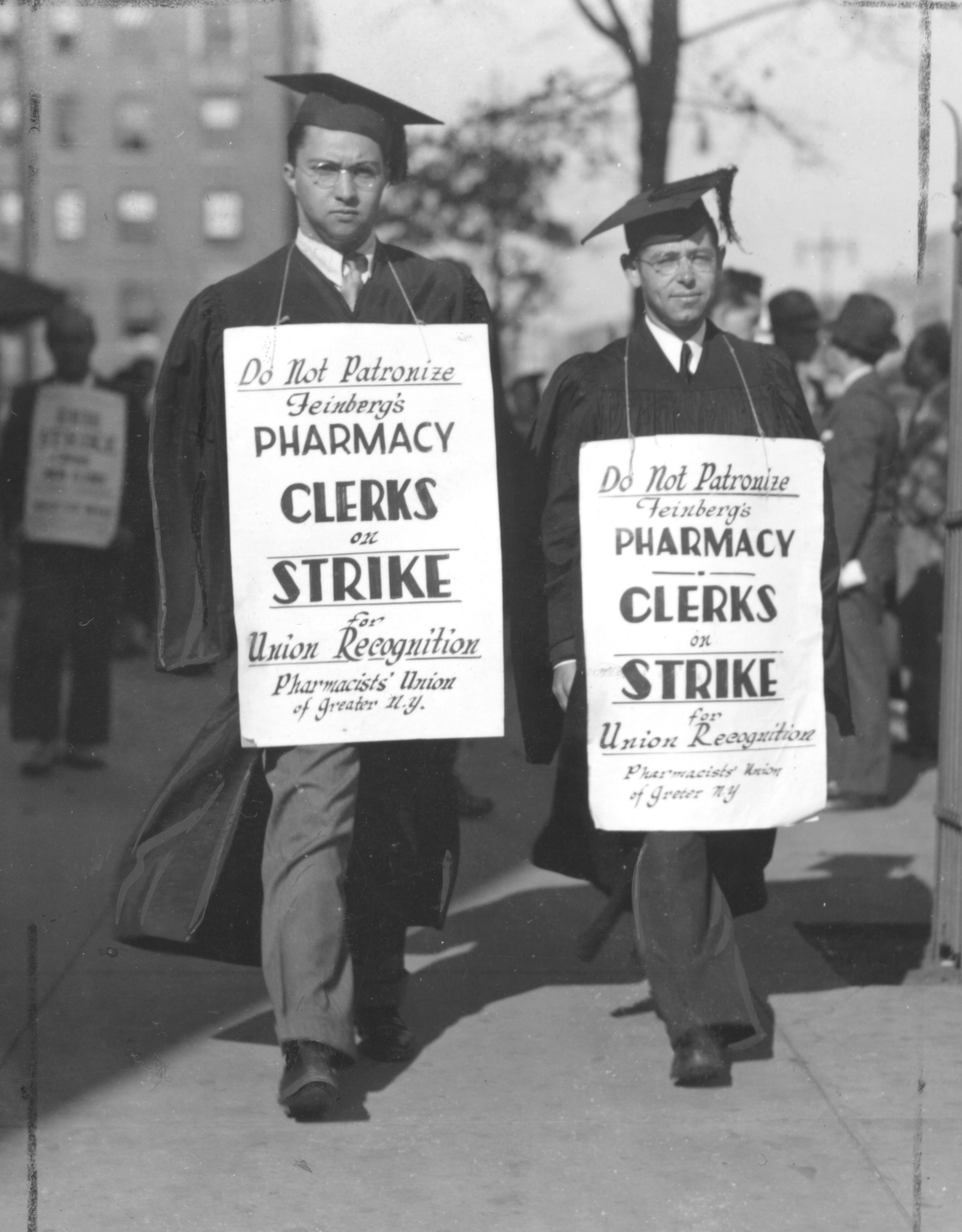 Picketing Pharmacists: The pharmacists Union of Greater New York organized drugstores in the Bronx in 1934. Several drugstore owners, including Meyer A. Feinberg, refused to sign union contracts. The Pharmacists Union called a strike against the owners who held out and pharmacists (as seen in the picture) picketed the non-union stores. The Union’s demands were for a closed shop, for registered pharmacists to receive a minimum wage of $32.50/week, a 54-hour work week, and one week paid vacation.